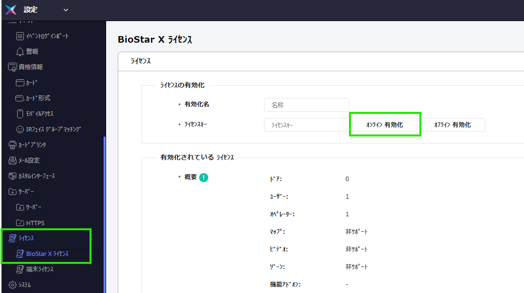 設定 > BioStar X ライセンス > (有効化名 と ライセンスキー を入力)> オンライン有効化