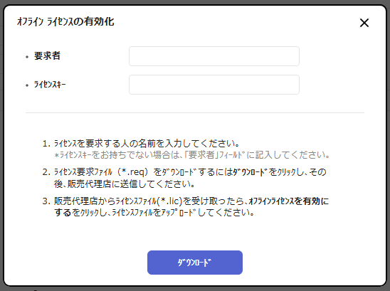 要求者名:つまり、会社名など(半角 英数字) と ライセンスキー を入力し、ダウンロード ボタンをクリック